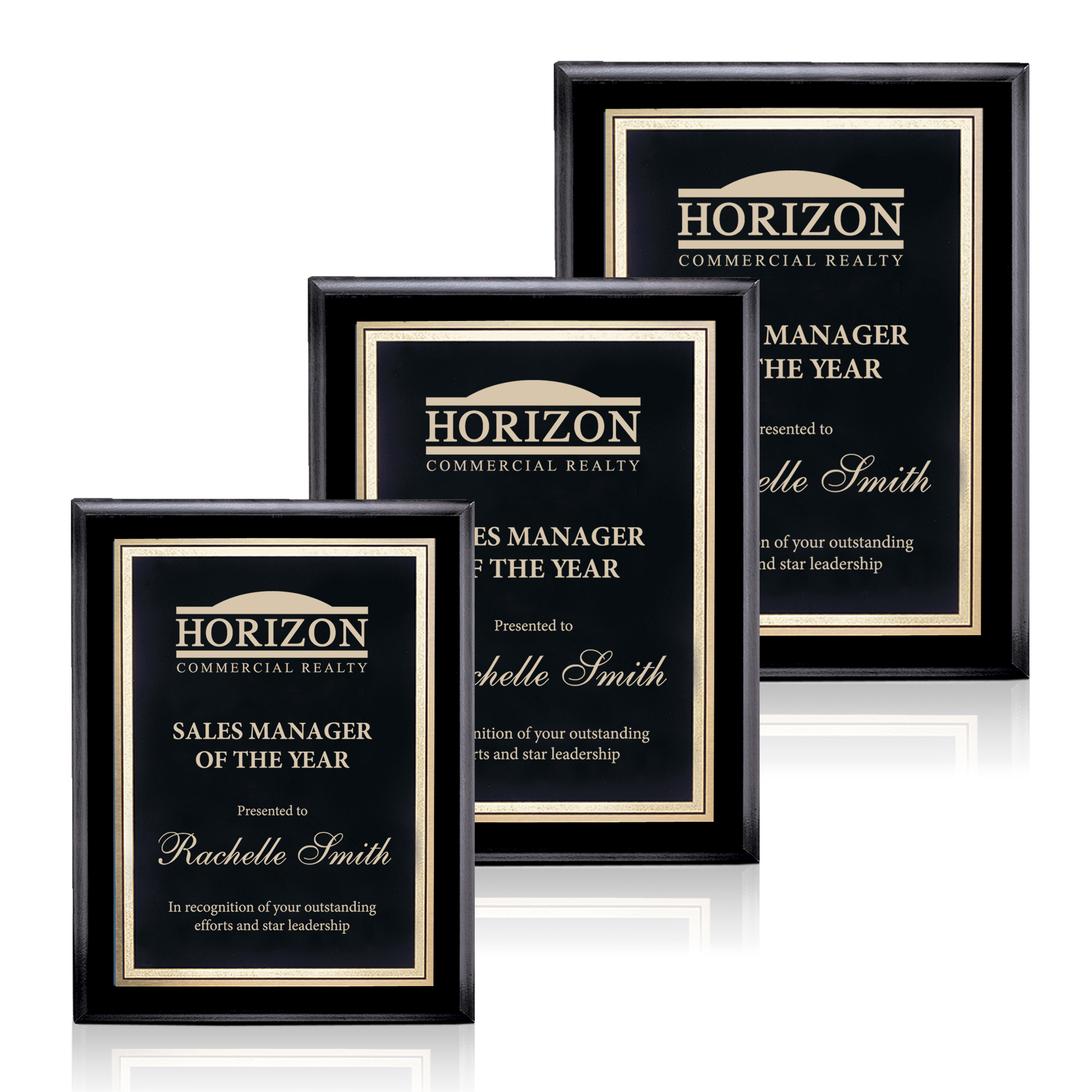 This custom sleek black finish varsity plaque is completed with a solid brass engraving plate, offering a striking contrast that enhances any message of recognition. Designed for versatility, it can be displayed vertically or horizontally to suit your presentation needs. Available in three sizes—7" x 9", 8" x 10", and 9" x 12"—this plaque is ideal for awards, dedications, or commemorative displays.